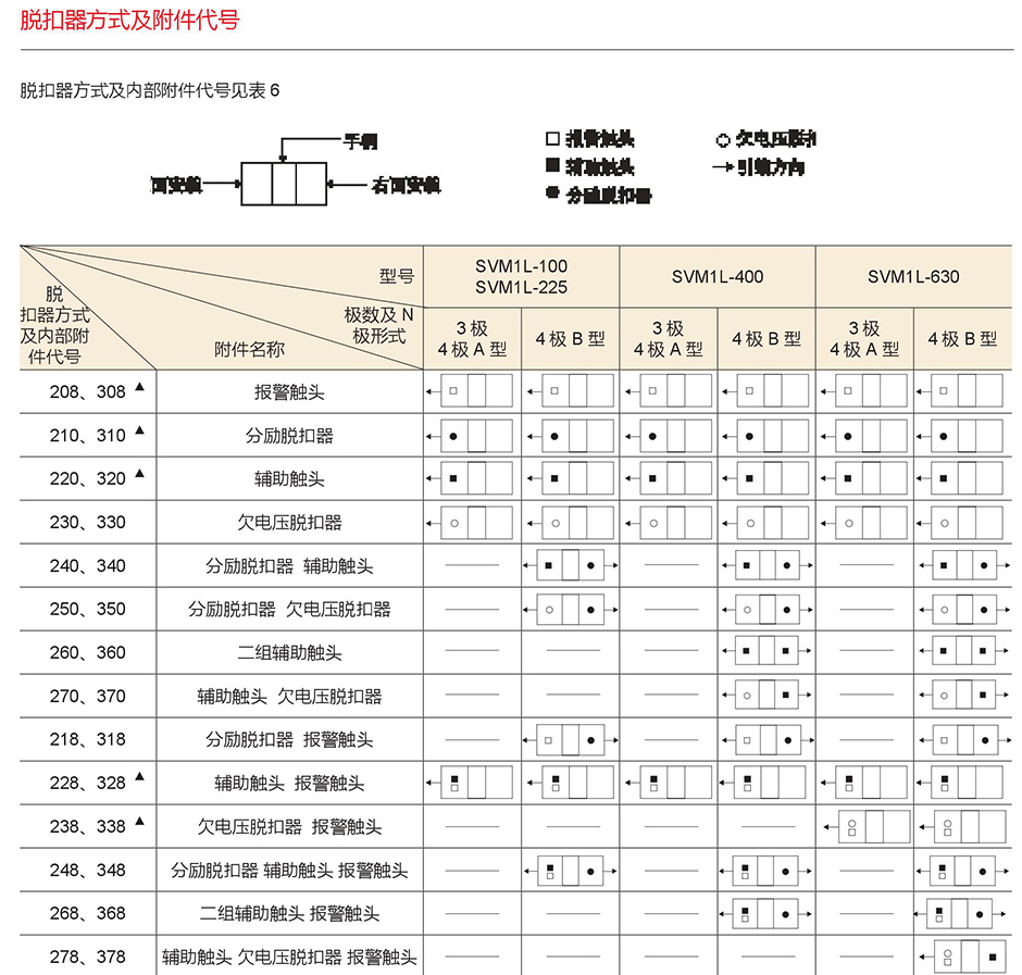 2. SVM1L-400、630 中 228、328、248、348 规格辅助触头为一对触头(即一常开,一常闭),268、368 规格辅助触头为三