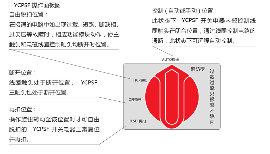 提醒值班人员检修故障线路,YCPSF 产品操作机构旋钮保持在闭合位置不跳闸,主电路不断开,此时可通过外接的停止按钮或面板上的旋钮断开主电路,故障排除后必须再扣或复位 ;